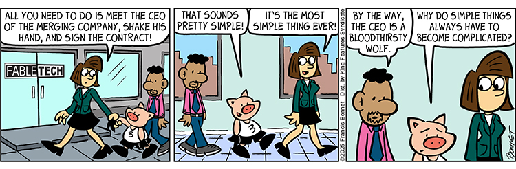 10/15/2025 Oct15 by francisbonnet on October 15, 2025 at 12:01 am Chapter: Suburban Fairy Tales Archive └ Tags: business, business professionals, cartoon, comic, comic artist, comic book, comic book artist, comic strip, comics, corporate life, corporation, drawing, fabletech, fairy tales, Francis Bonnet, funny, henry, humor, melanie, modern fairy tales, piggies, piggy, pigs, Suburban Fairy Tales, three little pigs, webcomic Comment
