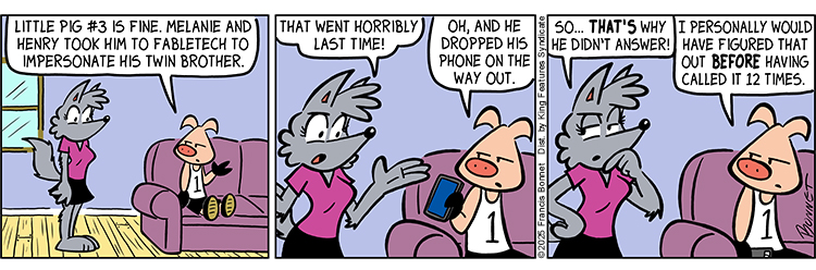 10/22/2025 Oct22 by francisbonnet on October 22, 2025 at 12:01 am Chapter: Suburban Fairy Tales Archive └ Tags: cartoon, comic, comic artist, comic book, comic book artist, comic strip, comics, drawing, fairy tales, Francis Bonnet, funny, humor, impersonate, impersonation, modern fairy tales, phone call, piggies, piggy, pigs, Suburban Fairy Tales, three little pigs, webcomic, wolfette, worried Comment
