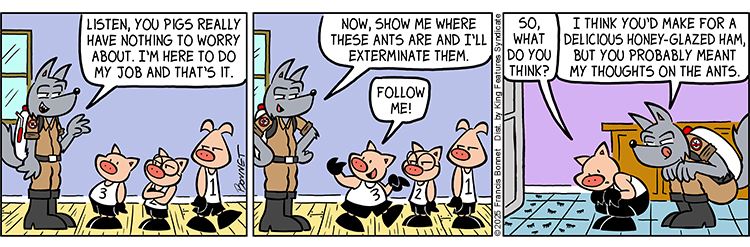 12/26/2025 Dec26 by francisbonnet on December 26, 2025 at 12:01 am Chapter: Suburban Fairy Tales Archive └ Tags: ant problem, ants, big bad wolf, bugs, cartoon, comic, comic artist, comic book, comic book artist, comic strip, comics, drawing, exterminate, exterminator, fairy tales, Francis Bonnet, funny, humor, modern fairy tales, piggies, piggy, pigs, Suburban Fairy Tales, three little pigs, webcomic, wolf Comment